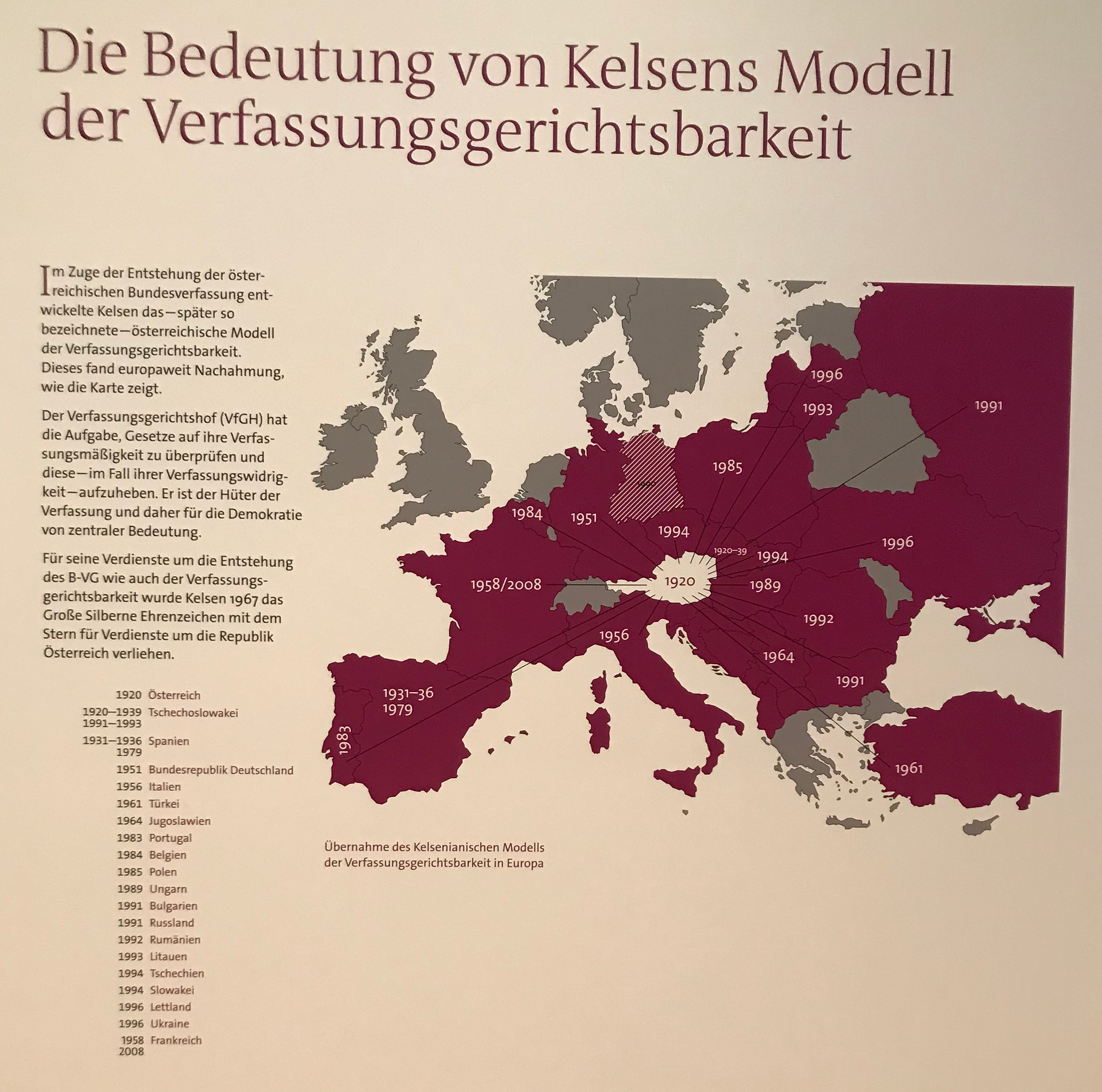 Im alten Besprechungsraum ist jetzt eine kleine Ausstellung untergebracht, die über die verschiedenen Aspekte und Bereiche der österreichischen Verfassung und Verfassungsgerichtsbarkeit informiert. So war den meisten von uns nicht bekannt, dass das von Hans Kelsen entwickelte österreichische Modell der Verfassungsgerichtsbarkeit im Laufe des 20. Jahrhunderts von vielen europäischen Staaten nachgeahmt wurde.